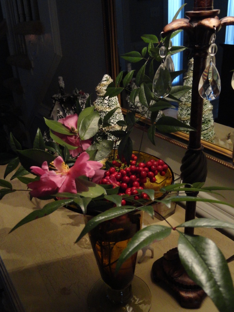 Here are a few arrangements I made with what is blooming and growing around our yard right now. Camellias and Nandina with some holly in between.